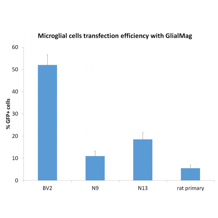 Glial-Mag는 미세아교세포(microglial) 세포주 및 1차 세포에서 최적의 전이 효율을 달성하도록 설계된 제품입니다.