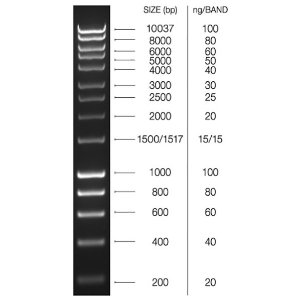 이 마커는 제한 효소 소화물과 PCR 생성물로 구성되며, 200 bp에서 10,037 bp까지 14개의 균일하게 배치된 밴드를 포함합니다. 특히 1000 bp 및 10,037 bp에서 더 밝은 참조 밴드와 1500/1517 bp의 더블렛 밴드로 신속한 크기 식별이 가능합니다.